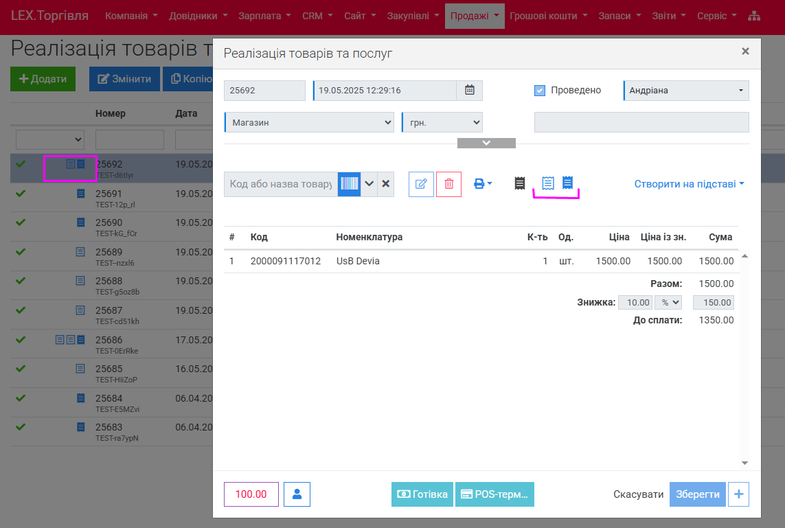 Після здійснення формуються чеки, які відображені відповідними іконками. Далі можна здійснити післяплату або наступну передплату, натиснувши кнопку (+) або вибравши пункт Передплату меню Створити на підставі. Програма автоматично визначить чи є операція передплатою чи післяплатою (післяплата повністю оплачує документ реалізації.)